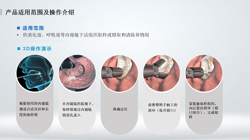 一性使用活体取样钳主要 用于临床内窥镜下胃、肠、膀胱、支气管等活组织取样,经过病理化验为疾病诊断提供科学依据。活体取样钳进入人体器管钳取组织,直接接触血液。因此在美国,加拿大及法国已经立法规定在内镜活检时必须使用一次性使用活体取样钳。在欧洲其他国家以及日本等国,一次性使用活体取样钳已经被医生及病人普遍接受并成为趋势。